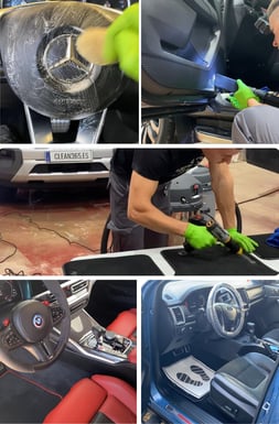 6. Revisión final y acabados: Perfumamos con ambientador, revisamos que estén bien todos los detalles y cubrimos volante con funda y protector para la alfombrilla.